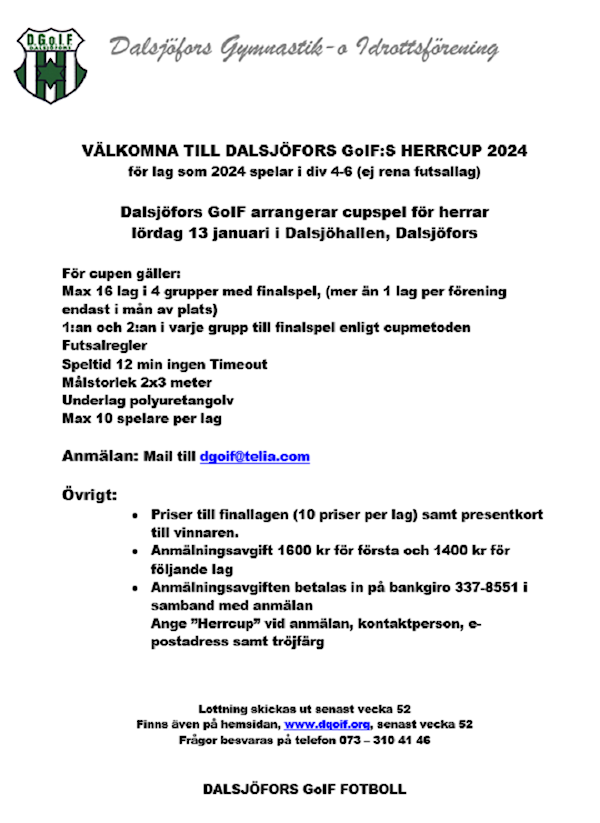 Varmt välkomna till Dalsjöfors Herrcup den 13 januari 2024! Information finns i bilden i denna nyhet!
