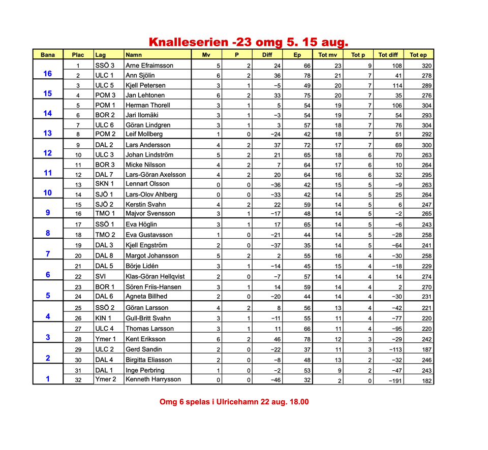 Spelresultat omg 5 knalleserien 15 augusti
