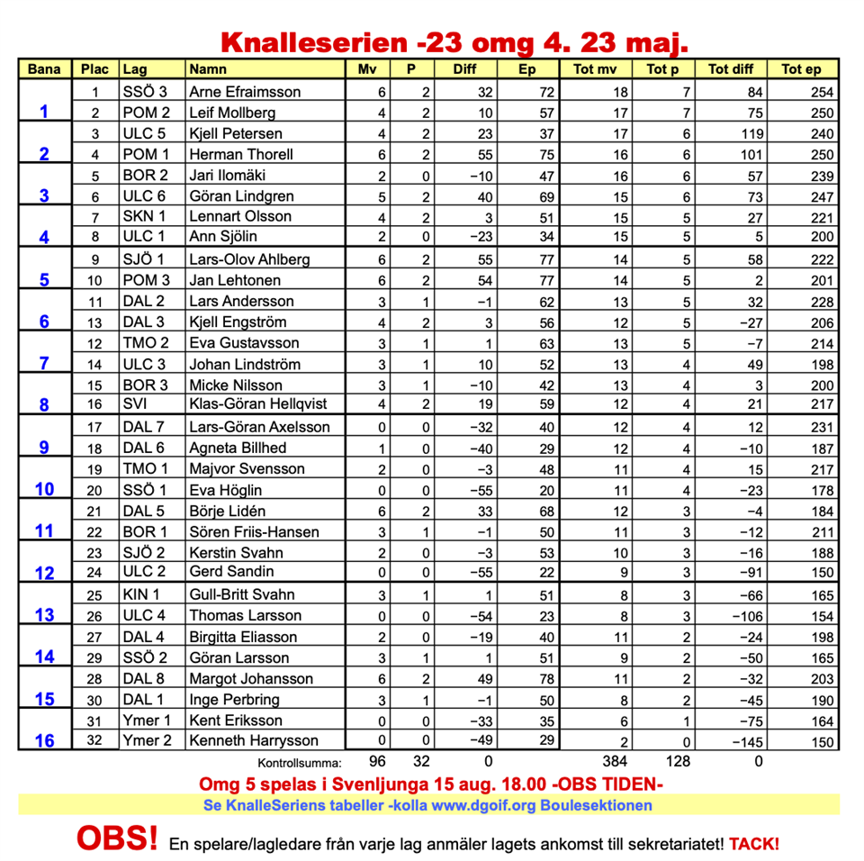 Ställning Knalleserien efter omgång 4 (inför omg 5) Boulesektionen 23 maj 2023 0kommentarer