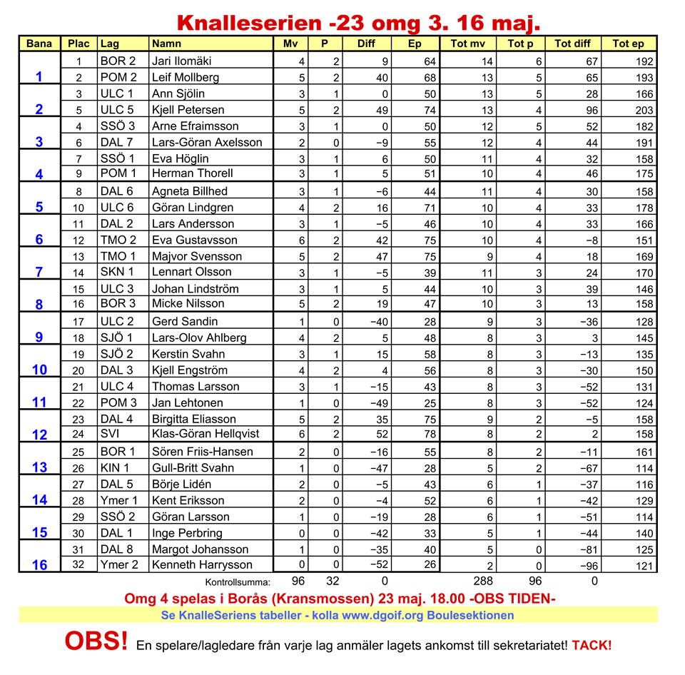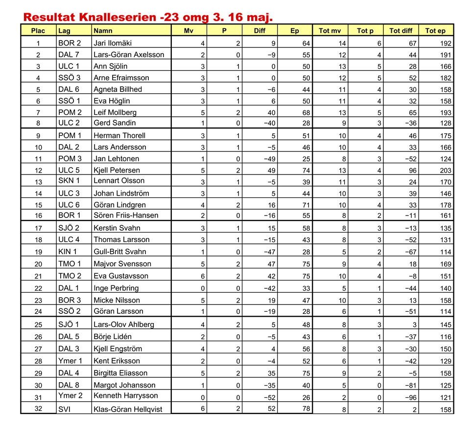 • Spelresultat Knalleserien spelomgång 3 16/5